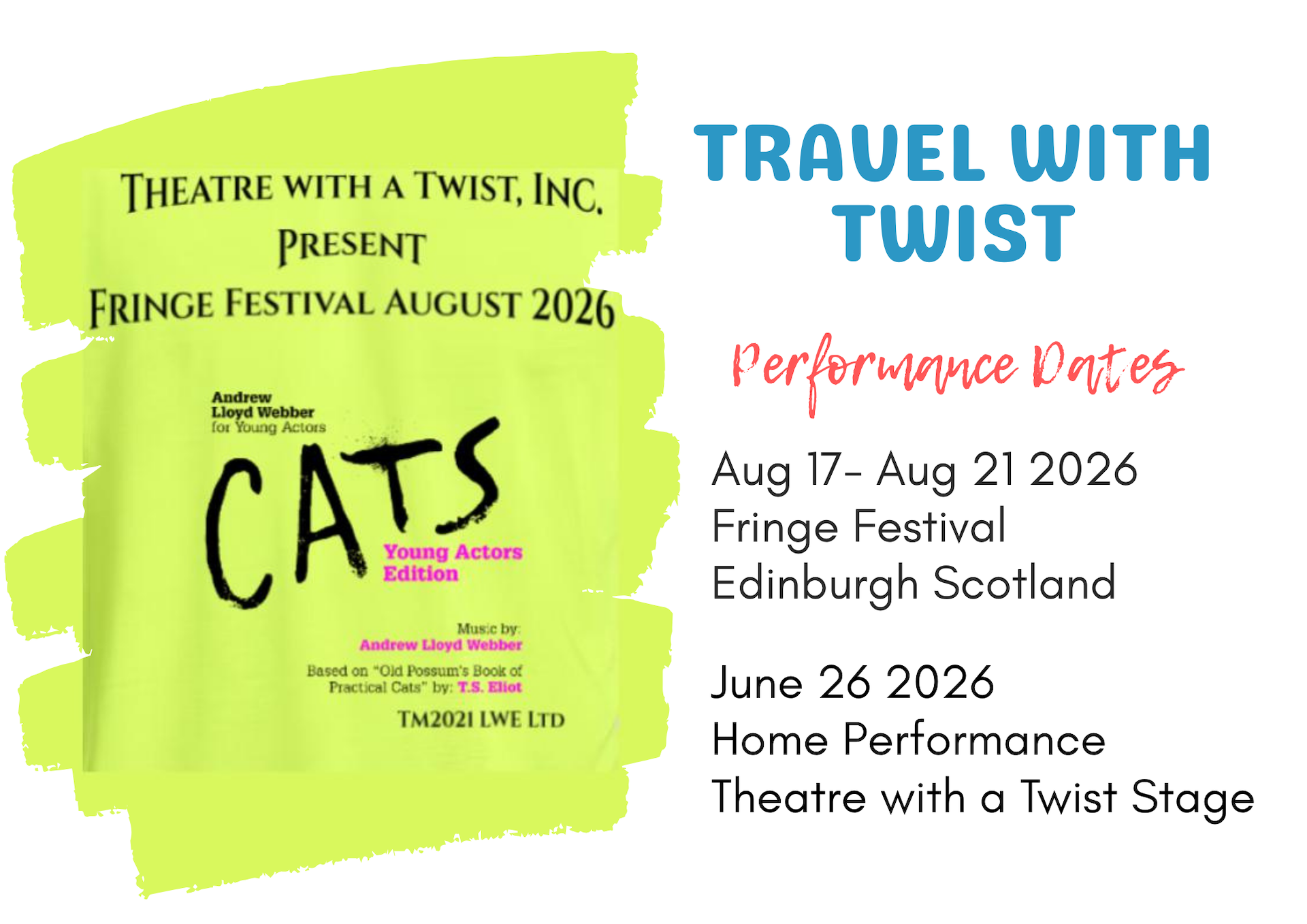 Theatre With A Twist, an Acton-based community theater that focuses on family and education, has found a residence at the Church of the Good Shepherd, 164 Newtown Road, Acton. The halls of Good Shepherd are filled many days during the week with the vibrant sounds of youth singing, dancing, and preparing for upcoming performances, which will also be presented at the church campus.